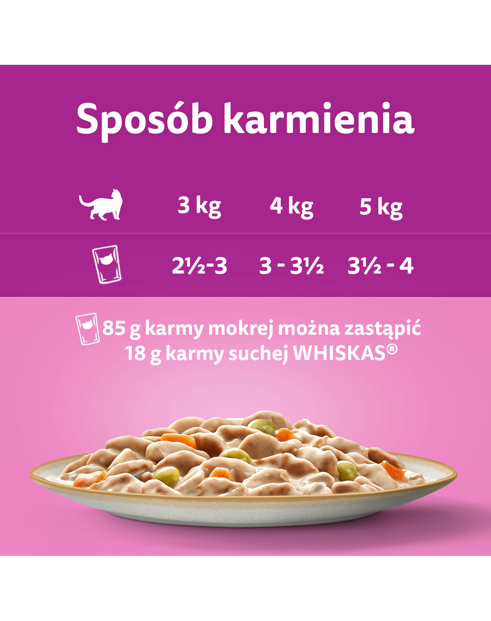 Výhody:Zloženie - kúsky s kuracím mäsom: kuracie mäso a živočíšne produkty (34 %, vrátane 4 % kuracích kúskov*), oleje a tuky, rastlinné produkty, zelenina (vrátane 1 % zmesi sušeného hrachu a mrkvy, čo zodpovedá 4 % zmesi hrachu a mrkvy), minerálne látky, rastlinné bielkovinové extrakty, cukry, mlieko a mliečne výrobky. *Kúsky zvyčajne tvoria 40 % výrobku