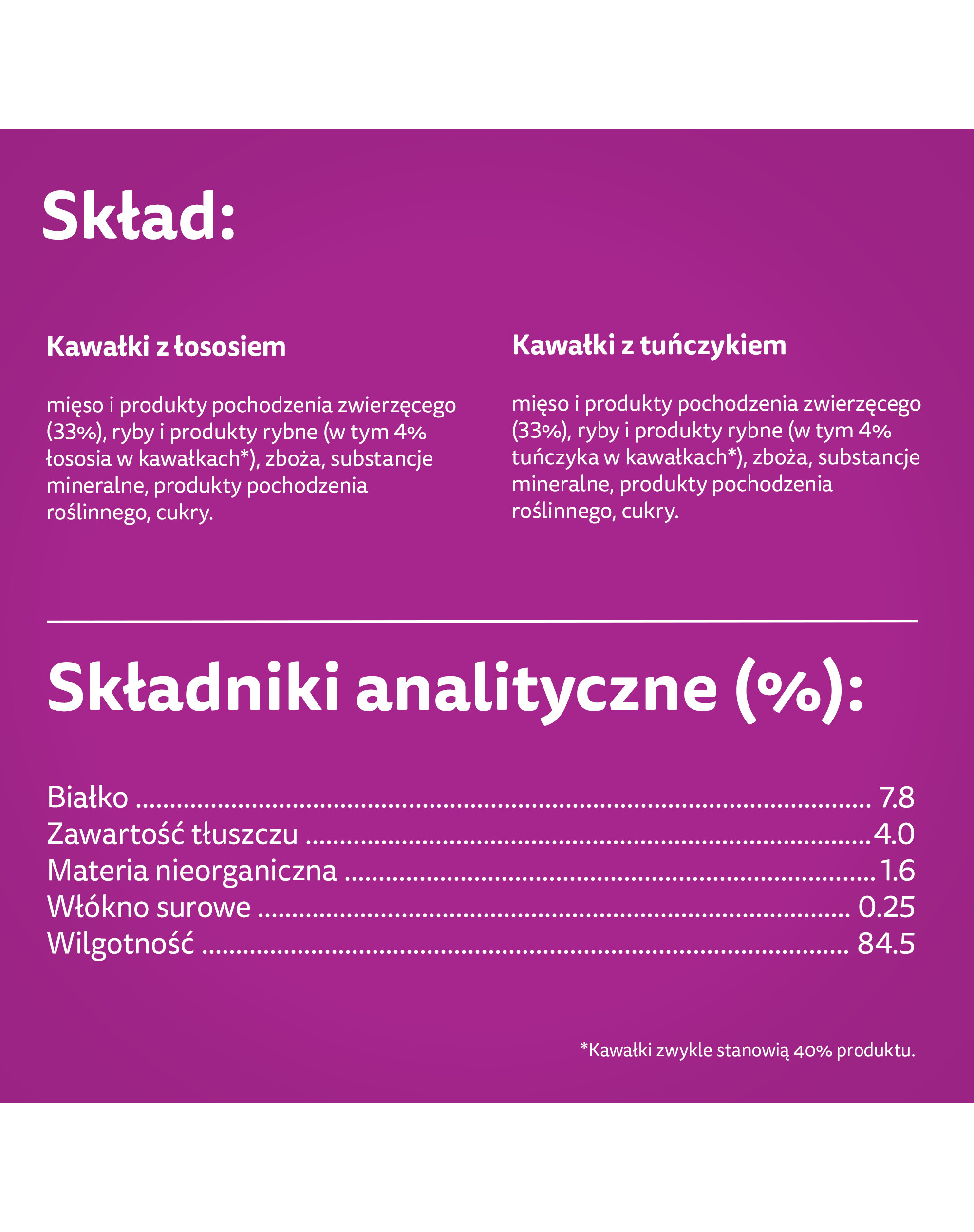 Zloženie - kúsky s tuniakom: mäso a živočíšne výrobky (33 %), ryby a výrobky z rýb (vrátane 4 % plátkov tuniaka*), obilniny, minerálne látky, výrobky rastlinného pôvodu, cukry. *Kúsky zvyčajne tvoria 40 % výrobku.