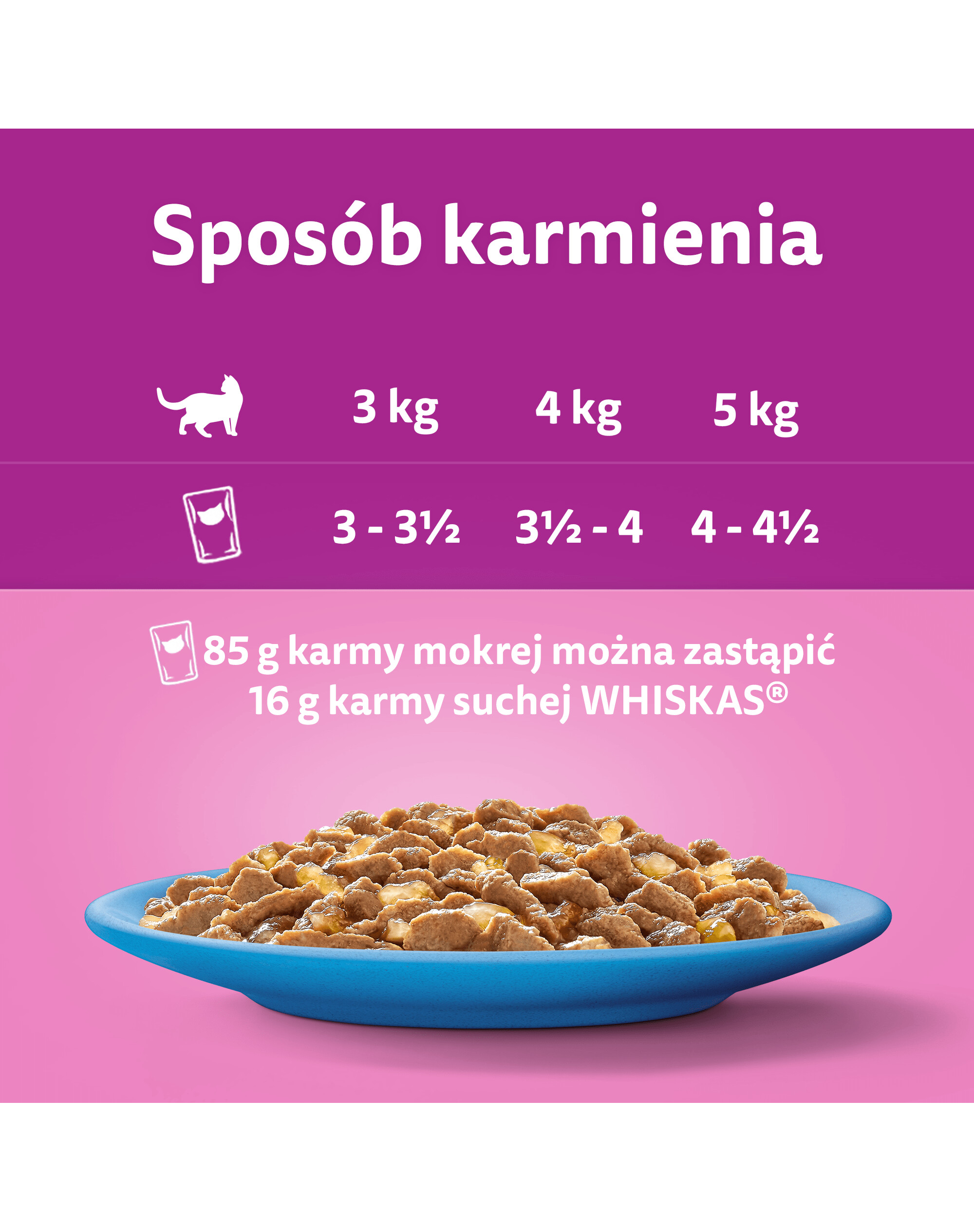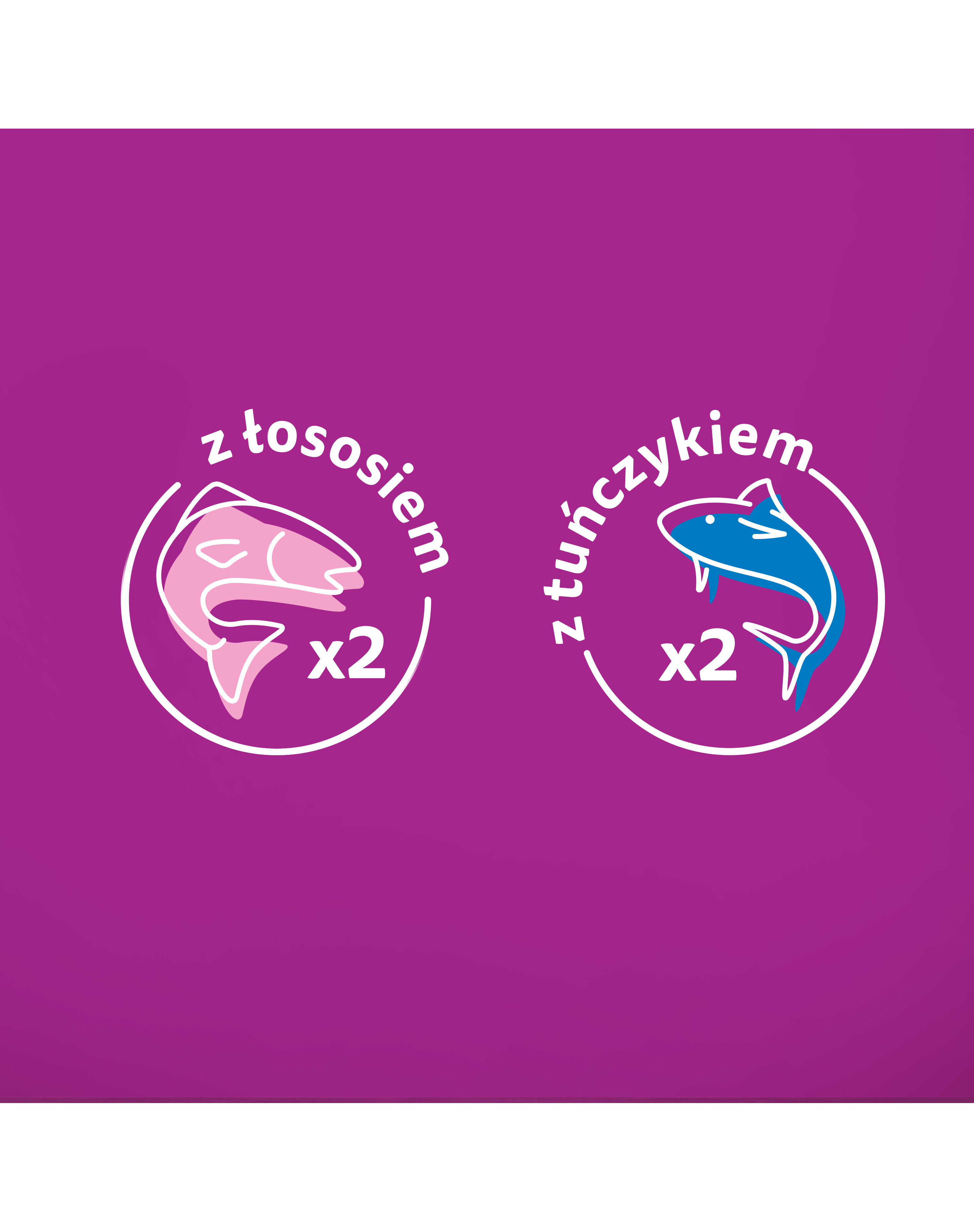 Naše krmivo Whiskas Fish Jelly Treats bolo špeciálne vyvinuté tak, aby si zachovalo prirodzenú výživovú hodnotu a chuť vysokokvalitných surovín. Vďaka nim vaša mačka príde k miske rýchlejšie ako kedykoľvek predtým! Vášmu mačaciemu priateľovi bude chutiť jeden z dvoch variantov: kúsky s lososom a s tuniakom. Toto chutné krmivo v praktickom vrecúšku obsahuje zinok na podporu zdravia kože a srsti, zatiaľ čo správna rovnováha minerálov pomáha starať sa o močové cesty vašej mačky. Od hravého mačiatka až po očarujúcu dospelú mačku - naše chutné receptúry sú navrhnuté tak, aby mačky všetkých vekových kategórií spokojne vrneli nielen pri jedle.