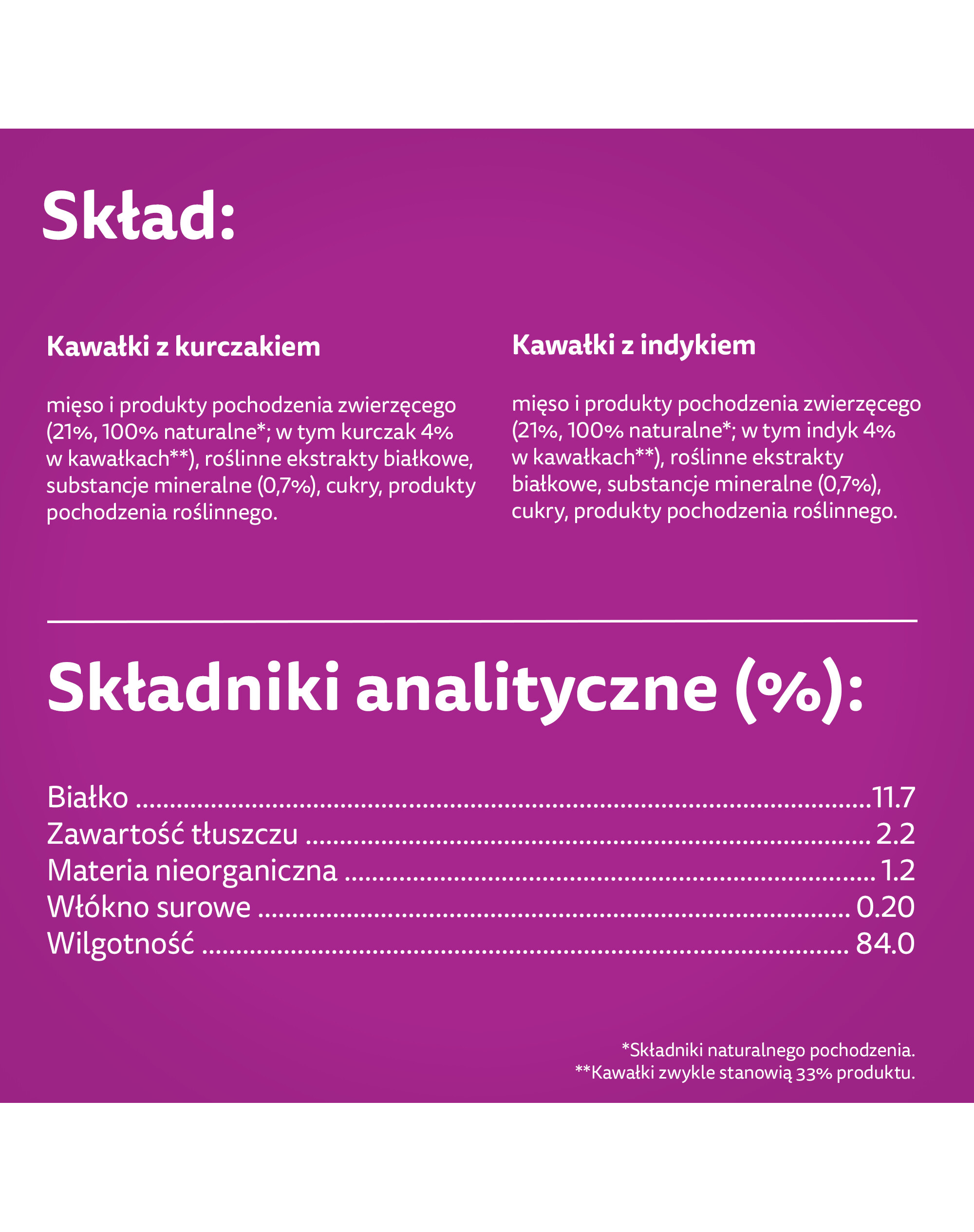 Lahodné hydinové frikasé Whiskas v želé sú pripravené tak, aby si zachovali svoju prirodzenú chuť a nutričnú hodnotu. Vďaka vareniu v pare sú šťavnaté a krehké, čo vašu mačku rozradostní. Váš mačací kamarát si pochutí na jednom z dvoch variantov: kúsky s kuracím mäsom as morčacím mäsom. Krmivo Whiskas je pripravené z prírodných ingrediencií a vysoko kvalitných bielkovín, bez použitia umelých farbív a konzervantov na výnimočný pôžitok z jedla. Ľahko jeteľné, lahodné a krehké kúsky obsahujú zinok, ktorý podporuje zdravú kožu a srsť, a správna rovnováha minerálov pomáha starať sa o stav močových ciest vášho maznáčika.