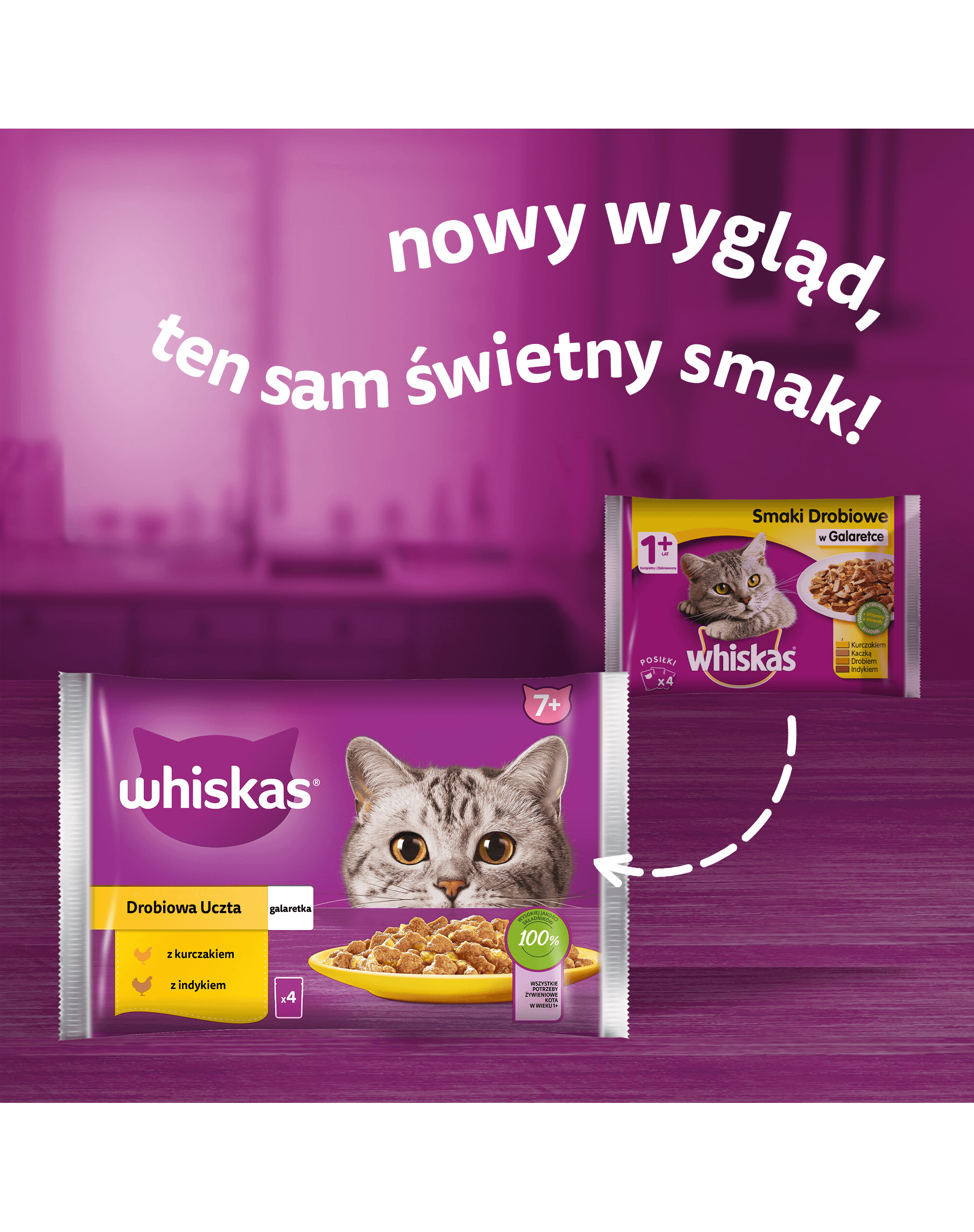 Naše krmivo Whiskas Poultry Jelly Feast bolo špeciálne vyvinuté pre staršie mačky, aby si zachovalo prirodzenú výživovú hodnotu a chuť vysokokvalitných surovín. Vaša mačka vďaka nim príde k miske rýchlejšie ako kedykoľvek predtým! Vášmu mačaciemu priateľovi bude chutiť jeden z dvoch variantov: kúsky s kuracím mäsom a s morčacím mäsom. Toto chutné krmivo v praktickom vrecúšku obsahuje zinok na podporu zdravia kože a srsti, zatiaľ čo správna rovnováha minerálov pomáha starať sa o zdravie močových ciest vašej mačky. Naše chutné receptúry sú navrhnuté tak, aby vaša mačka spokojne vrčala pri jedle aj mimo neho.