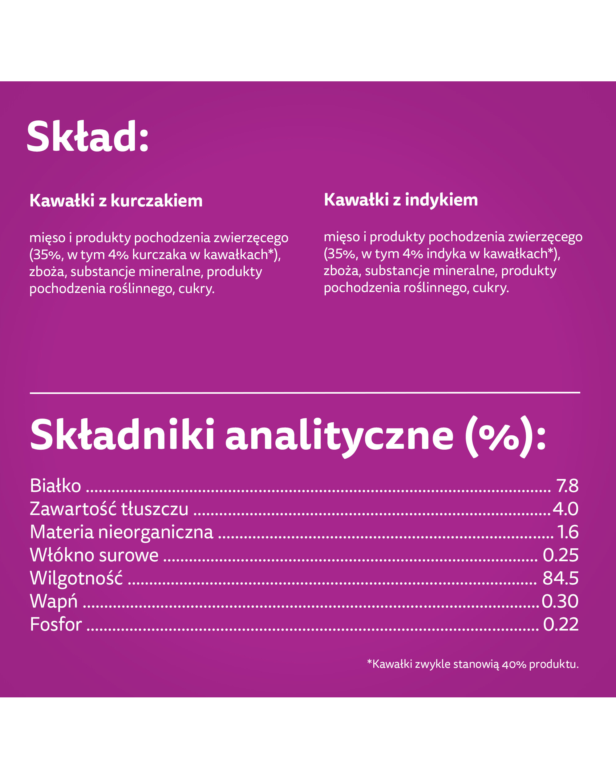 Kúsky s morčacím mäsom - zloženie: mäso a výrobky živočíšneho pôvodu (35 %, vrátane 4 % morčacích kúskov*), obilniny, minerálne látky, výrobky rastlinného pôvodu, cukry. *Krájané mäso zvyčajne tvorí 40 % výrobku.