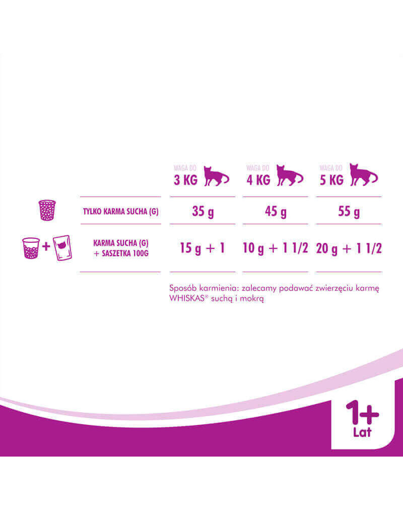 1 vrecúško vlhkého krmiva a 15 g suchého krmiva na deň, mačka s hmotnosťou 4 kg