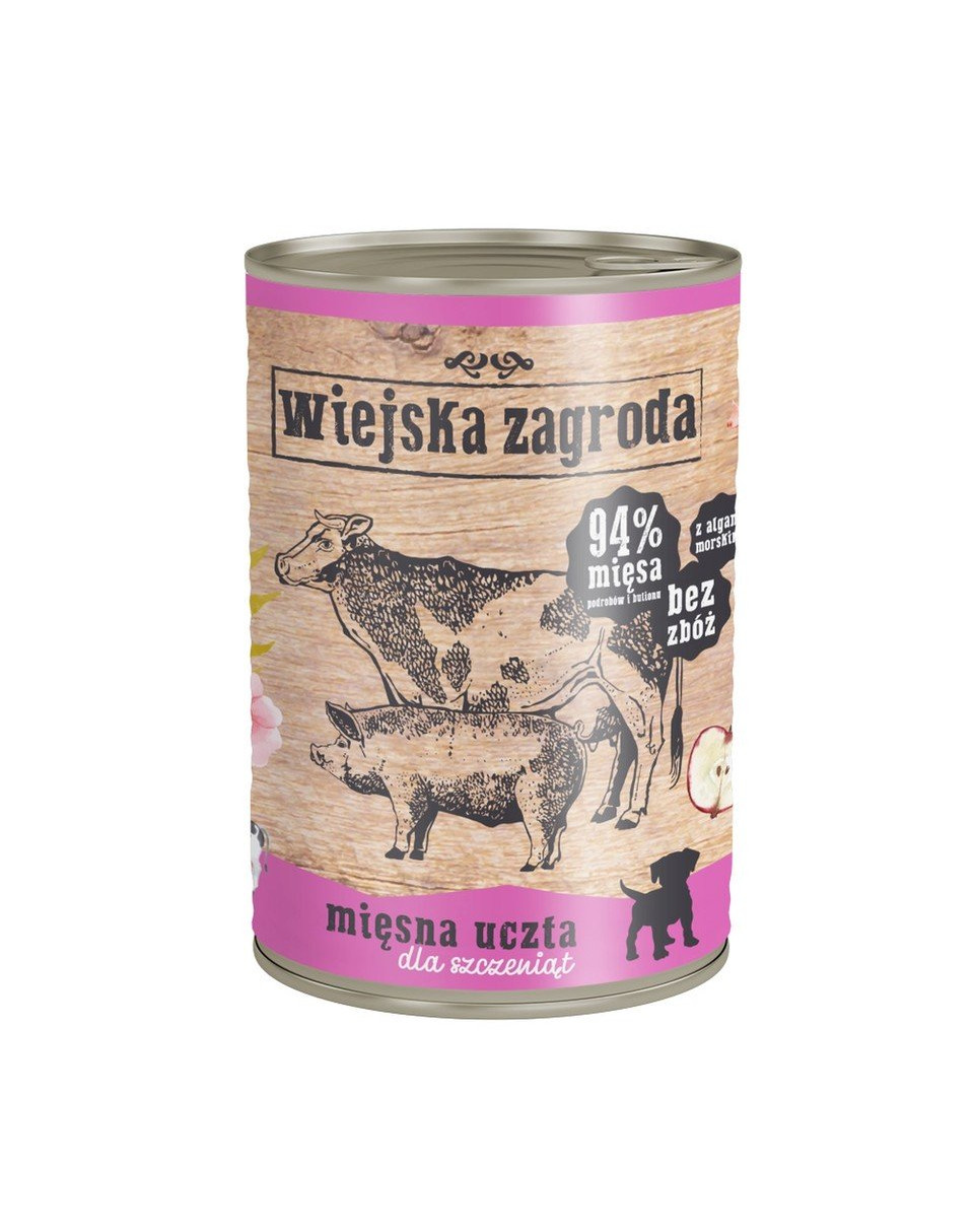 Zloženie: Hovädzie mäso 24% (mäso, pľúca, obličky); morčacie mäso 24% (mäso, srdce); bravčové mäso 22% (pečeň, pľúca); mäsový vývar 23,9%; jablká 4%; minerály 1%; inulín 0,3%; lososový olej 0,7%; morské riasy (spirulina) 0,1%