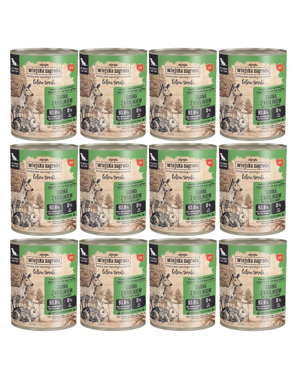 ZLOŽENIE: 53 % jelenina, 15 % králik (7 % mäso, 3 % srdce, 3 % obličky, 2 % pľúca), 25,8 % vývar, 4 % maliny, 1 % minerály, 0,3 % lososový olej, 0,2 % sušené pivovarské kvasnice, 0,2 % spirulina, 0,2 % juka Mojave, 0,2 % šípky, 0,1 % mäta.