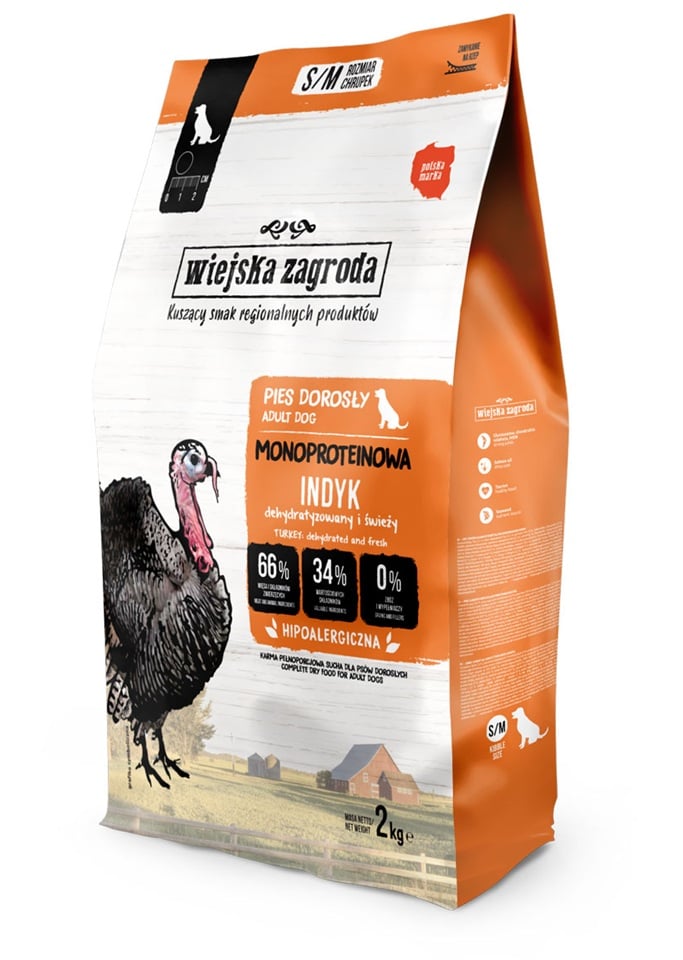 Rad monoproteínových krmív Wiejska Zagroda je vyvážená strava určená pre psy s citlivým tráviacim traktom a pre psy náchylné na alergie. Používanie iba jedného zdroja živočíšnych bielkovín a vyhýbanie sa obilninám a strukovinám znižuje riziko nežiaducich reakcií na krmivo, zatiaľ čo rad prísad podporujúcich zdravie podporuje zdravé trávenie a môže zmierniť zápaly spôsobené alergiami alebo opakujúcimi sa žalúdočnými problémami. Zložky tiež podporujú zdravie pokožky a prevenciu ochorení kĺbov.
