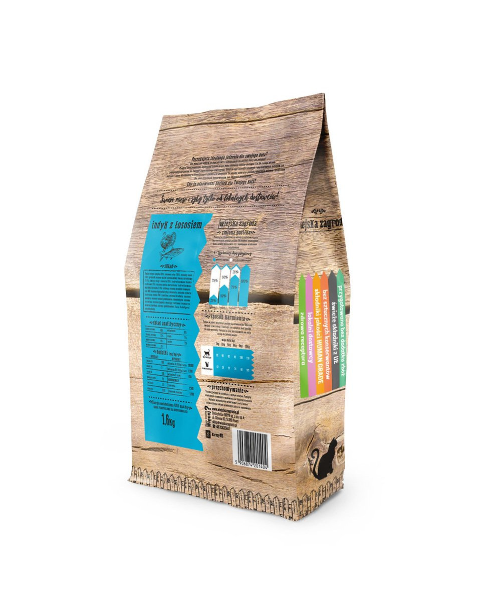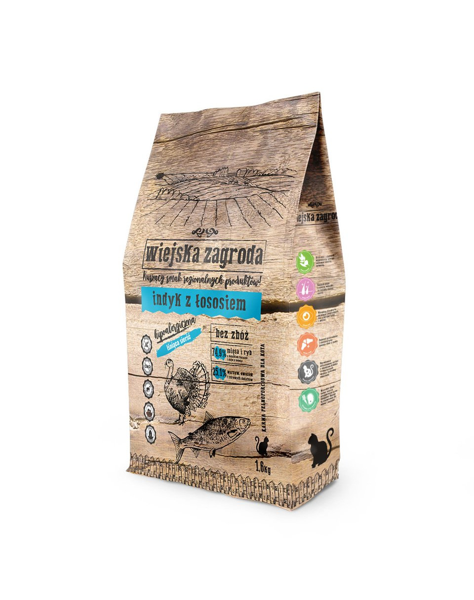 Potraviny na báze mäsa s prídavkom lososového tuku a oleja. Obsahuje 24,3% ovocia, zeleniny a doplnkových prísad. Vysoký obsah mäsa, a tým aj živočíšnych bielkovín a nenasýtených mastných kyselín, zaručuje dokonalý tvar tela a lesklý, silný srsť. Receptúra bez zŕn je pre mačky biologicky vhodná. Nezaťažuje tráviaci systém a nenarúša rovnováhu elektrolytov v tele. Hlavnou zložkou je čerstvé morčacie mäso a prídavkom sú sušené ryby vrátane lososa. Tento recept je vyvážený a veľmi chutný. Poskytuje omega mastné kyseliny, taurín a kompletný proteín.