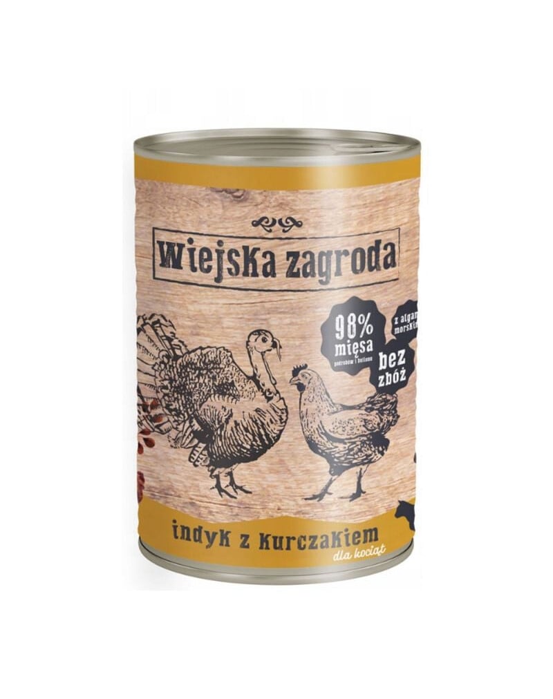 morčacie mäso 35% (z toho cca 80% svaloviny a srdca, cca 20% pečene), kuracie mäso 35% (100% svaloviny), morčací a kurací vývar 28,4%, minerálne látky 1%, lososový olej 0,5%, spirulina 0,1%.