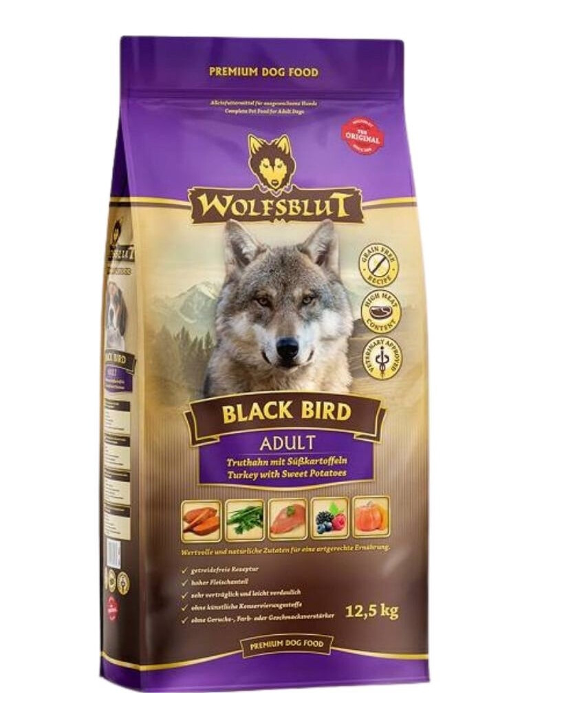 WOLFSBLUT BLACK BIRD ADULT kompletné suché krmivo pre dospelé psy s morčacím mäsom, v ktorom sa spája výživa predkov s modernými potrebami vášho psa. Vďaka tomu si váš pes môže každý deň vychutnávať prirodzenú a primeranú výživu.