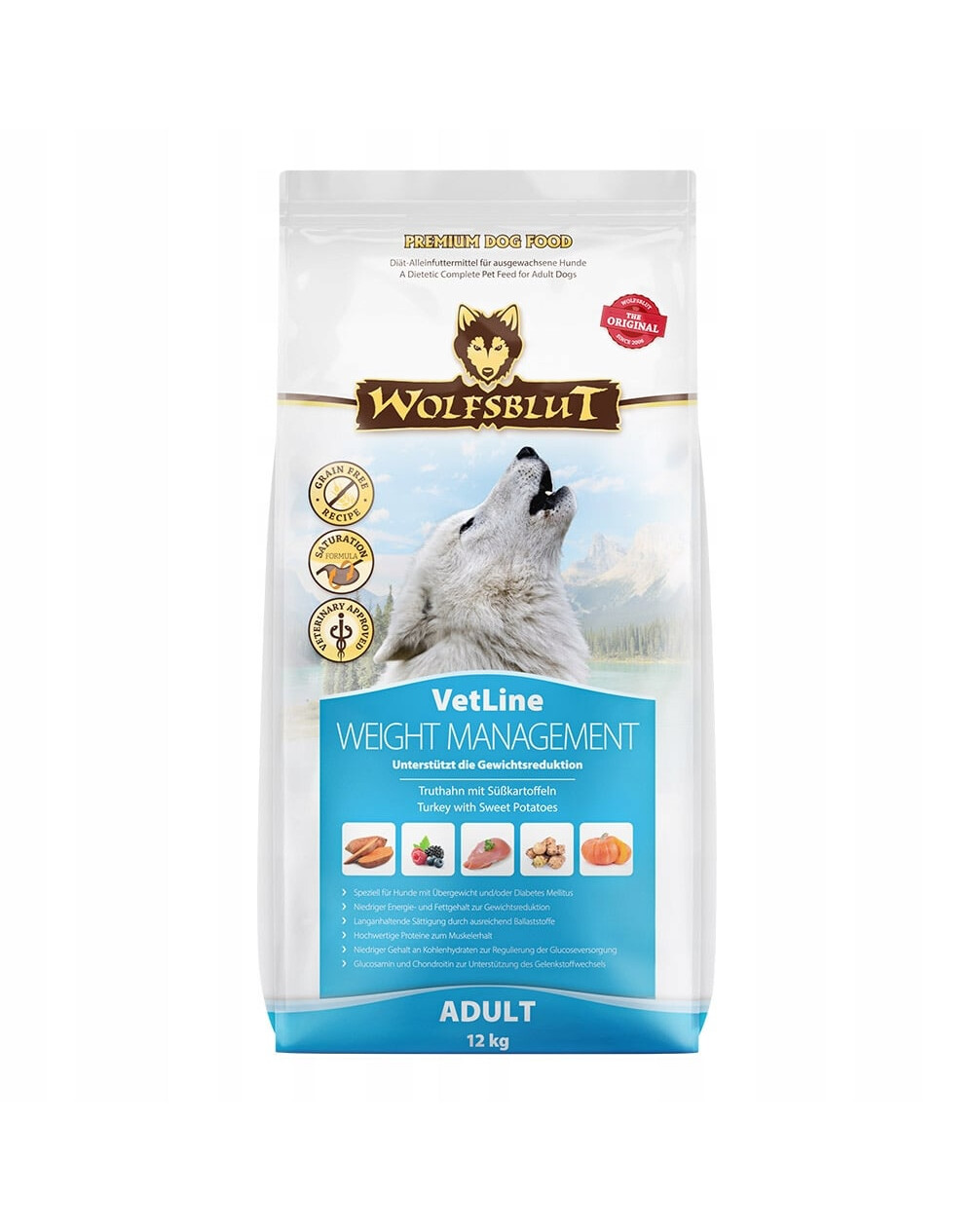 Wolfsblut VetLine WEIGHT MANAGEMENT je špeciálne kompletné diétne krmivo prispôsobené potrebám psov s obezitou a cukrovkou. Krmivo obsahuje vysoký obsah bielkovín v kombinácii s nízkym obsahom tuku a energie. L-karnitín tiež zabezpečuje odbúravanie tuku pri zachovaní svaloviny. Zvýšený obsah vlákniny zabezpečuje dlhotrvajúci pocit sýtosti. Obezita nadmerne zaťažuje kĺby. Glukosamín a chondroitín prispievajú k zdravému metabolizmu kĺbov a pomáhajú tak udržiavať ich funkciu. Okrem toho je krmivo prispôsobené potrebám psov diabetikov, pretože sacharidy, ktoré spôsobujú rýchle uvoľňovanie glukózy, boli udržiavané na čo najnižšej úrovni. Týmto spôsobom sa prirodzene reguluje prísun glukózy.