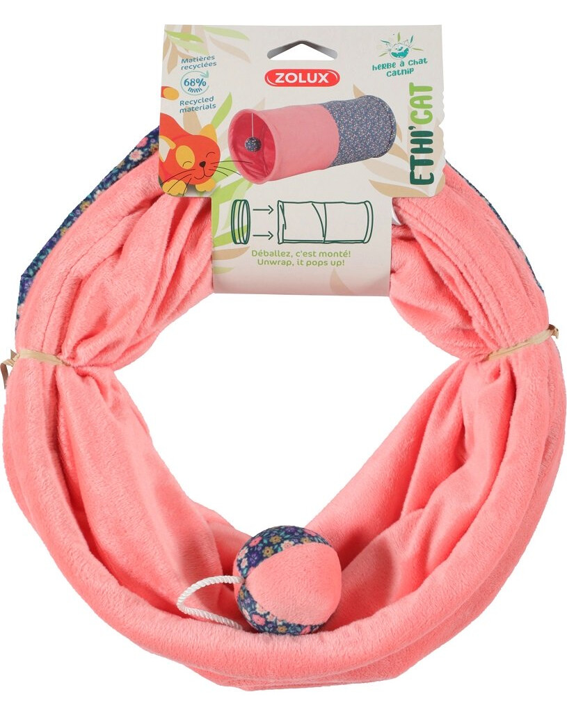Tunel ZOLUX Ethi'Cat je jedinečná hračka, ktorá poskytne vašej mačke atraktívnu, viacrozmernú zábavu, stimuluje jej lovecký inštinkt a podnecuje ju k objavovaniu. Je vyrobená z plyšovej tkaniny, na jednej strane zdobená motívom kvetov a napustená mačacou mätou, ktorá stimuluje zmysly mačky a podnecuje ju k aktivite. Hračka má dva vchody a na jednej strane zavesenú mäkkú farebnú loptičku, ktorá pohybom rozvíja vrodené lovecké správanie zvieraťa. Tunel dokáže mačku zabaviť na dlhé hodiny, slúži jej na prieskum aj na odpočinok (ako jej tajný azyl). Je ľahká a tvarovateľná, dá sa ľahko zložiť a premiestniť, takže je vhodná na hranie v interiéri aj exteriéri.