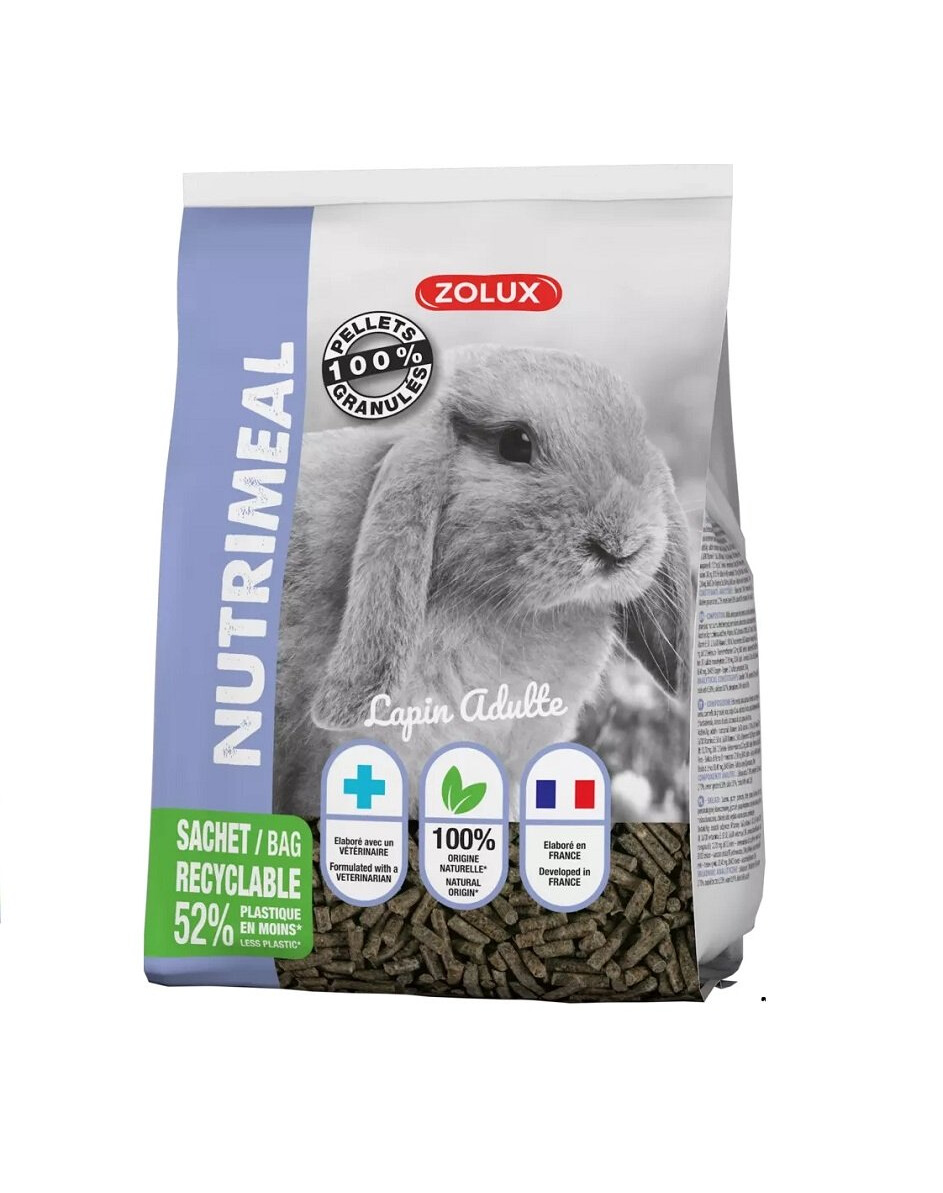 ZOLUX NUTRIMEAL 3 pelety pre dospelé bylinožravé králiky (staršie ako 6 mesiacov) obsahuje 100 % granúl, t. j. zmes zdravých prírodných surovín, lisovaných pri vysokej teplote a tvarovaných do hrudiek. Jeho konzumácia poskytuje domácim zvieratám vyváženú stravu, podporuje opotrebovanie zubov a reguluje ich rast. Táto receptúra krmiva tiež zabraňuje tomu, aby sa jedlo prekrmilo. Vláknina uľahčuje prechod tráviaceho obsahu a chráni srdce a cievy. Správne množstvo vápnika zabraňuje tvorbe obličkových kameňov.